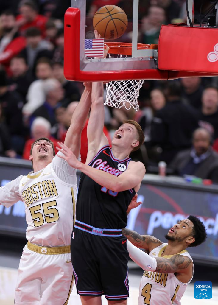 Chicago Bulls' Kevin Huerter (C) drives to the basket during the 2025-2026 NBA regular season basketball game between Boston Celtics and Chicago Bulls in Chicago, the United States, Jan. 24, 2026. (Photo by Joel Lerner/Xinhua)