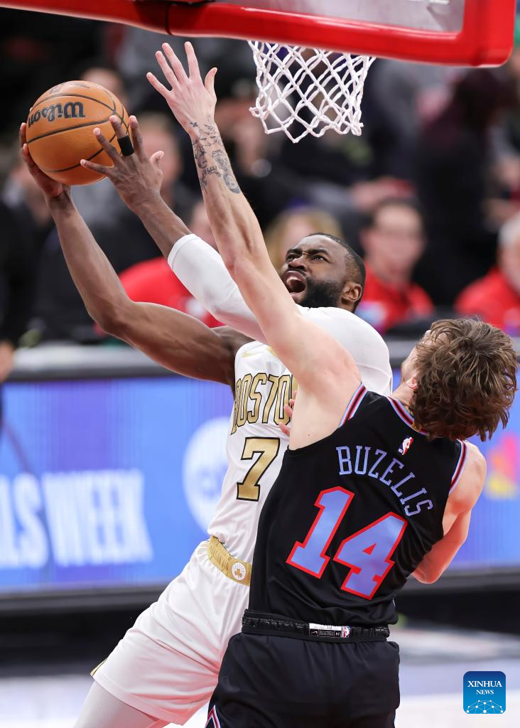 Boston Celtics' Jaylen Brown (L) drives to the basket during the 2025-2026 NBA regular season basketball game between Boston Celtics and Chicago Bulls in Chicago, the United States, Jan. 24, 2026. (Photo by Joel Lerner/Xinhua)
