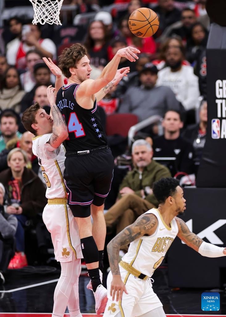 Chicago Bulls' Matas Buzelis (2nd L) throws a pass during the 2025-2026 NBA regular season basketball game between Boston Celtics and Chicago Bulls in Chicago, the United States, Jan. 24, 2026. (Photo by Joel Lerner/Xinhua)
