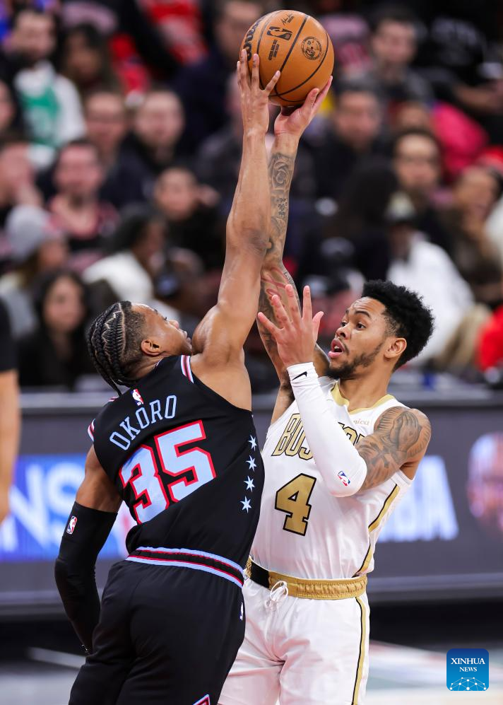 Boston Celtics' Anfernee Simons (R) is blocked by Chicago Bulls' Isaac Okoro during the 2025-2026 NBA regular season basketball game between Boston Celtics and Chicago Bulls in Chicago, the United States, Jan. 24, 2026. (Photo by Joel Lerner/Xinhua)