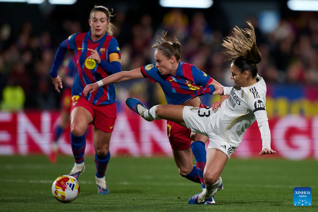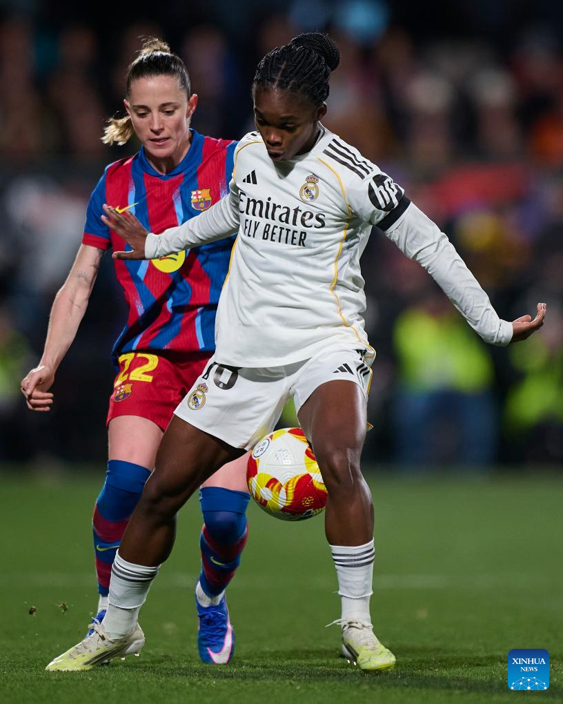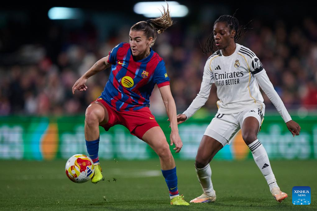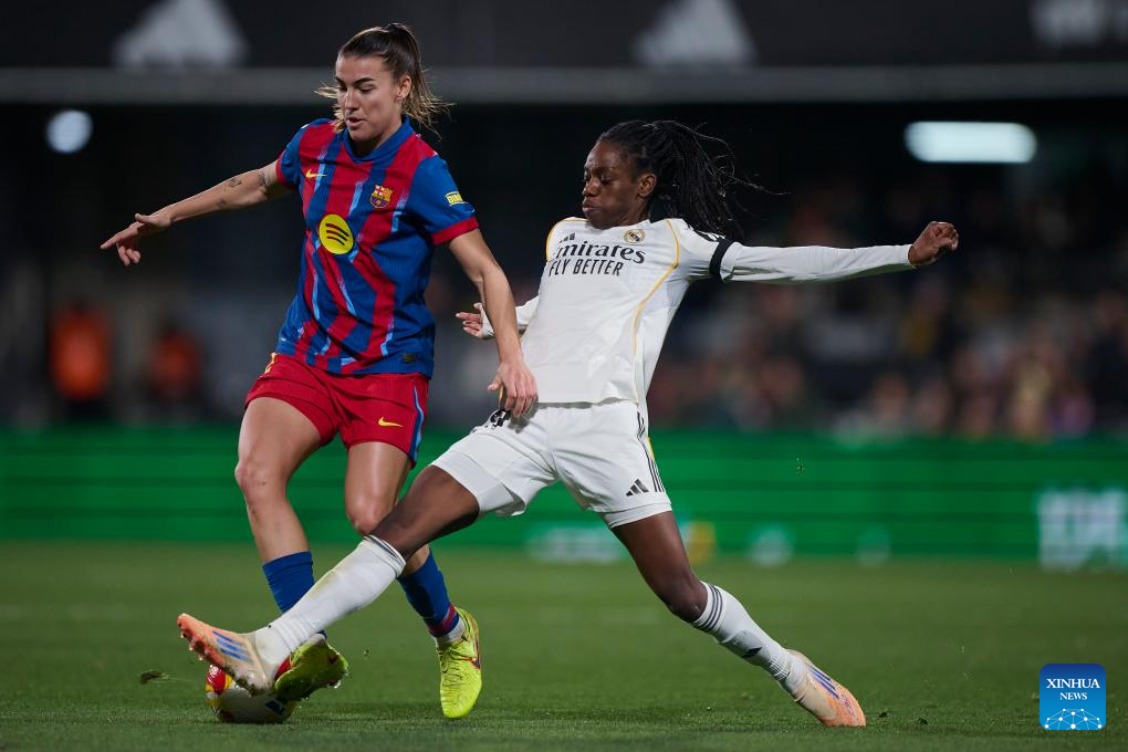 Ona Batlle (L) of Barcelona competes for the ball with Linda Caicedo of Real Madrid during the final of Spanish Women's Super Cup between Barcelona and Real Madrid in Castellon, Spain, Jan. 24, 2026. (Str/Xinhua)