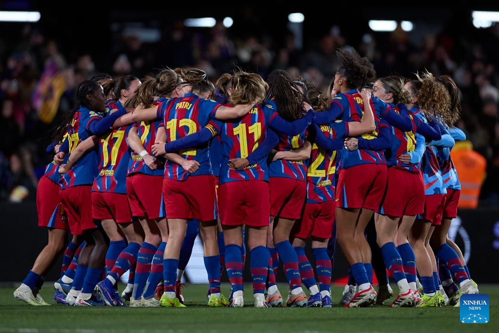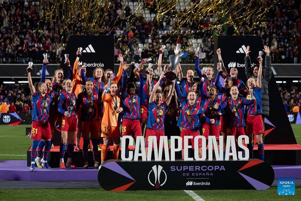 Players of Barcelona celebrate the victory after the final of Spanish Women's Super Cup between Barcelona and Real Madrid in Castellon, Spain, Jan. 24, 2026. (Str/Xinhua)