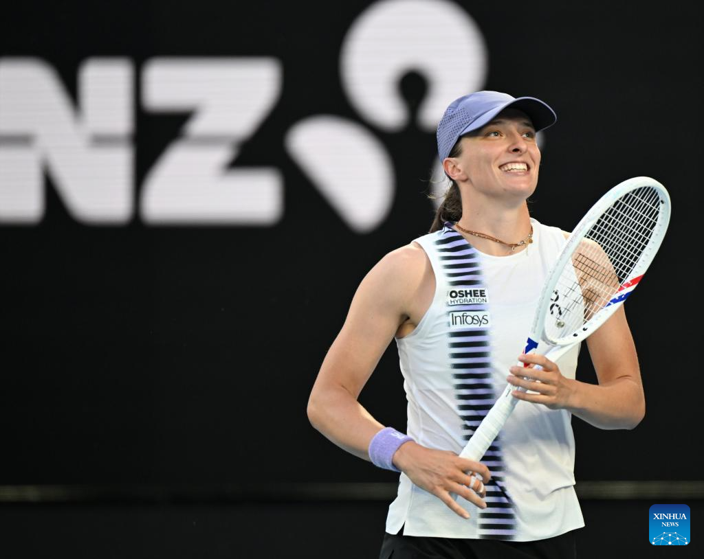 Iga Swiatek reacts during the women's singles 4th round match between Maddison Inglis of Australia and Iga Swiatek of Poland at the Australian Open tennis tournament in Melbourne, Australia, Jan. 26, 2026. (Photo by Wang Shen/Xinhua)