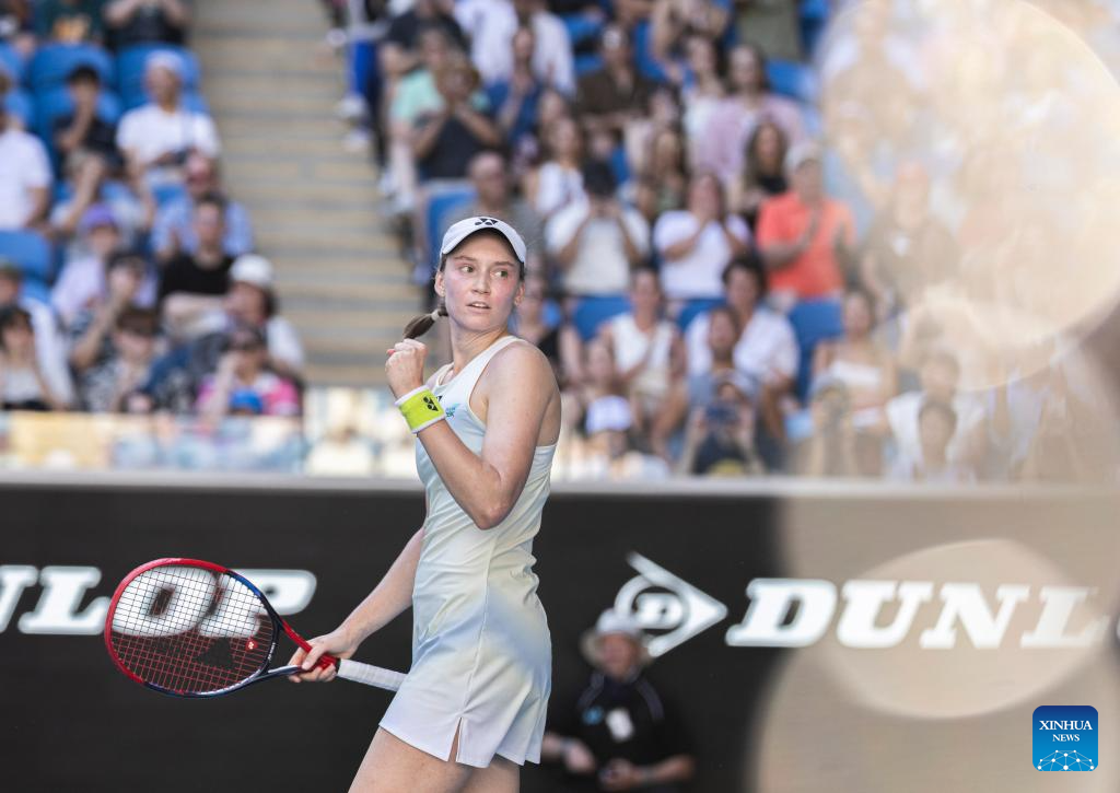 Elena Rybakina of Kazakhstan celebrates winning after the women's singles 4th round match between Elena Rybakina of Kazakhstan and Elise Mertens of Belgium at the Australian Open tennis tournament in Melbourne, Australia, Jan. 26, 2026. (Photo by Hu Jingchen/Xinhua)