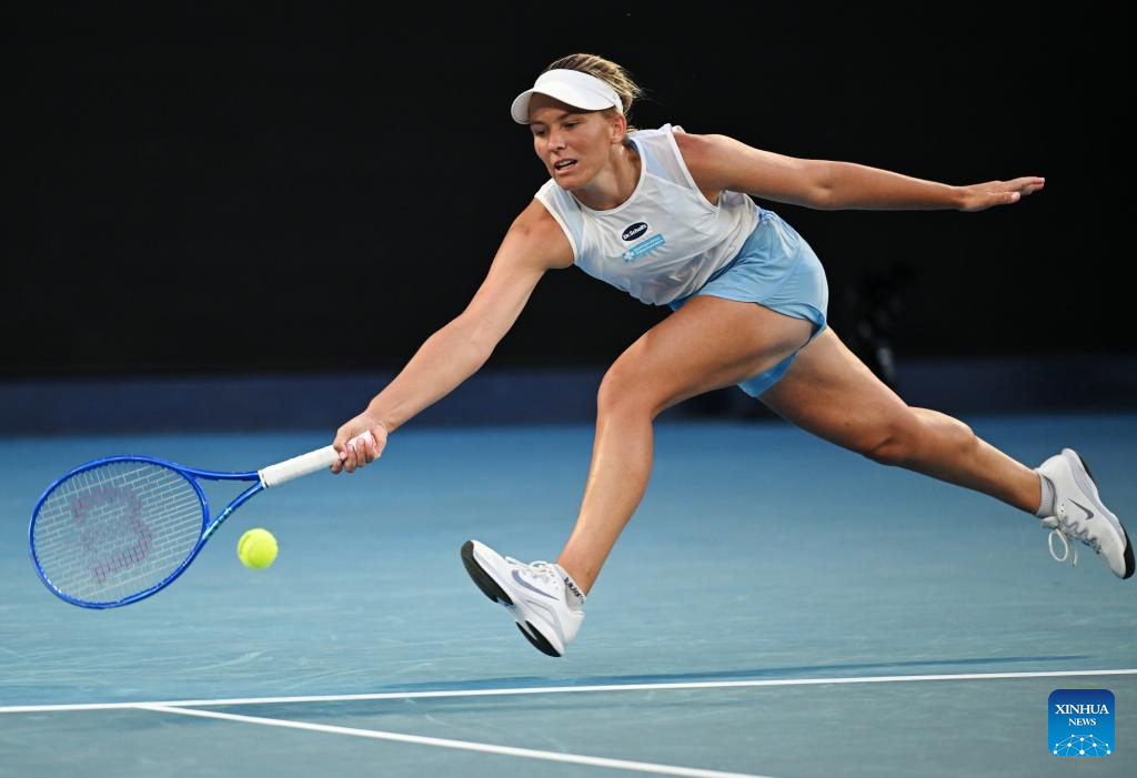 Maddison Inglis hits a return during the women's singles 4th round match between Maddison Inglis of Australia and Iga Swiatek of Poland at the Australian Open tennis tournament in Melbourne, Australia, Jan. 26, 2026. (Photo by Wang Shen/Xinhua)