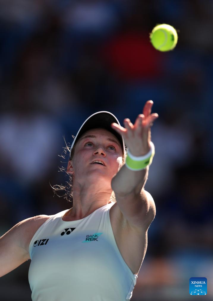 Elena Rybakina of Kazakhstan serves during the women's singles 4th round match between Elena Rybakina of Kazakhstan and Elise Mertens of Belgium at the Australian Open tennis tournament in Melbourne, Australia, Jan. 26, 2026. (Xinhua/Ma Ping)