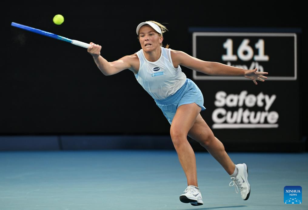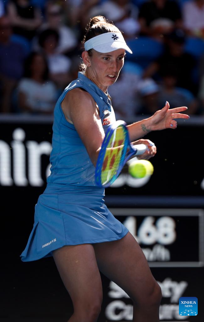 Elise Mertens of Belgium hits a return during the women's singles 4th round match between Elena Rybakina of Kazakhstan and Elise Mertens of Belgium at the Australian Open tennis tournament in Melbourne, Australia, Jan. 26, 2026. (Xinhua/Ma Ping)