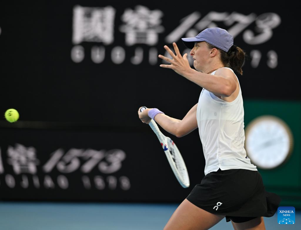 Iga Swiatek hits a return during the women's singles 4th round match between Maddison Inglis of Australia and Iga Swiatek of Poland at the Australian Open tennis tournament in Melbourne, Australia, Jan. 26, 2026. (Photo by Wang Shen/Xinhua)