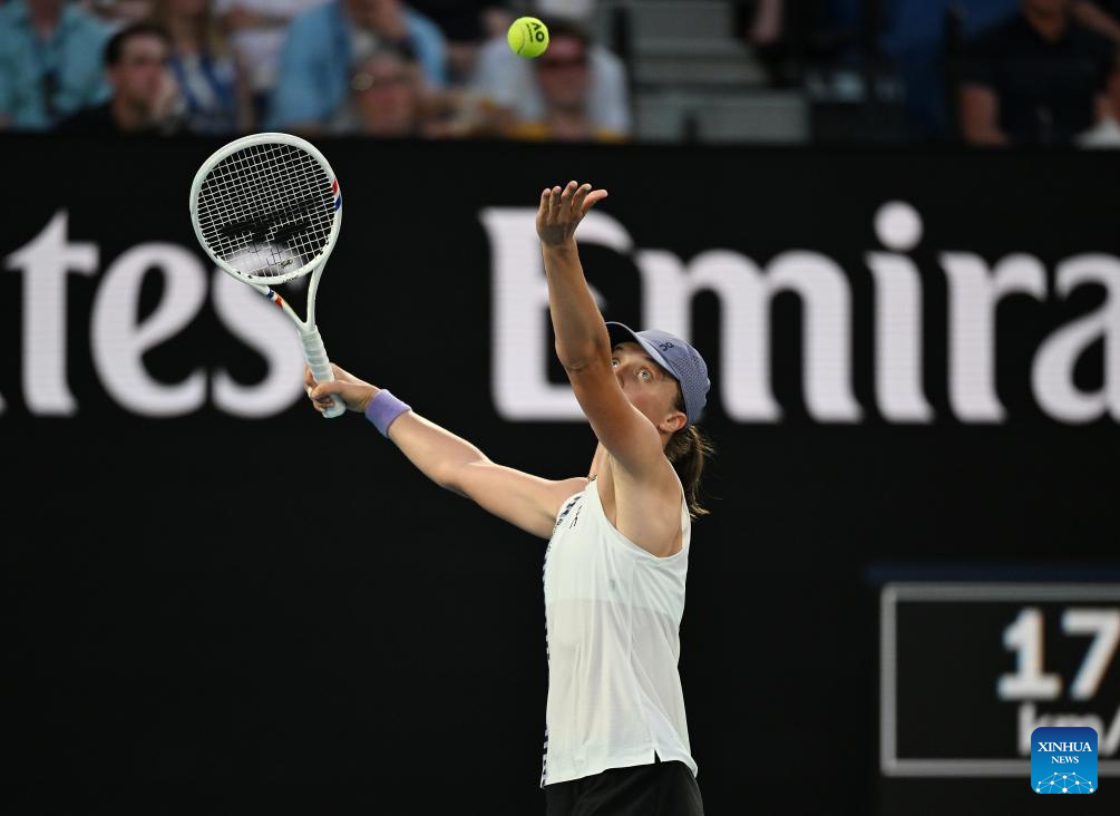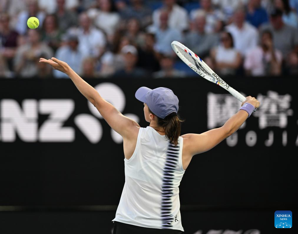 Iga Swiatek serves during the women's singles 4th round match between Maddison Inglis of Australia and Iga Swiatek of Poland at the Australian Open tennis tournament in Melbourne, Australia, Jan. 26, 2026. (Photo by Wang Shen/Xinhua)
