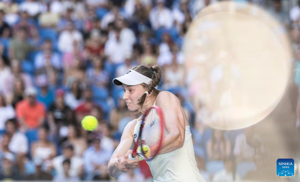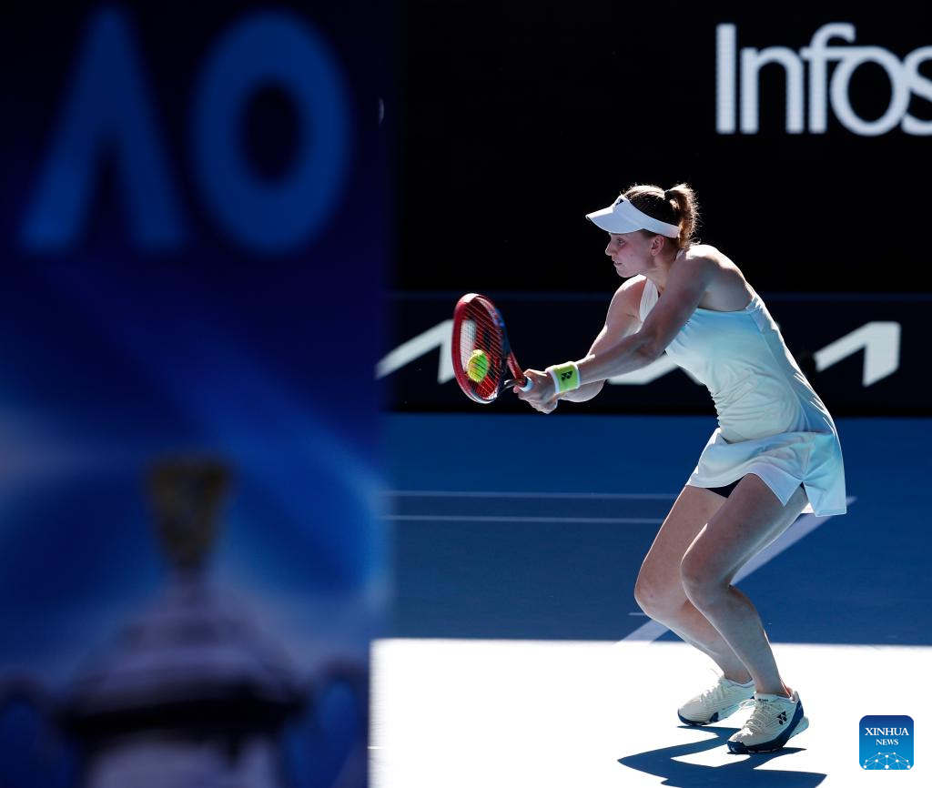 Elena Rybakina of Kazakhstan hits a return during the women's singles 4th round match between Elena Rybakina of Kazakhstan and Elise Mertens of Belgium at the Australian Open tennis tournament in Melbourne, Australia, Jan. 26, 2026. (Xinhua/Ma Ping)