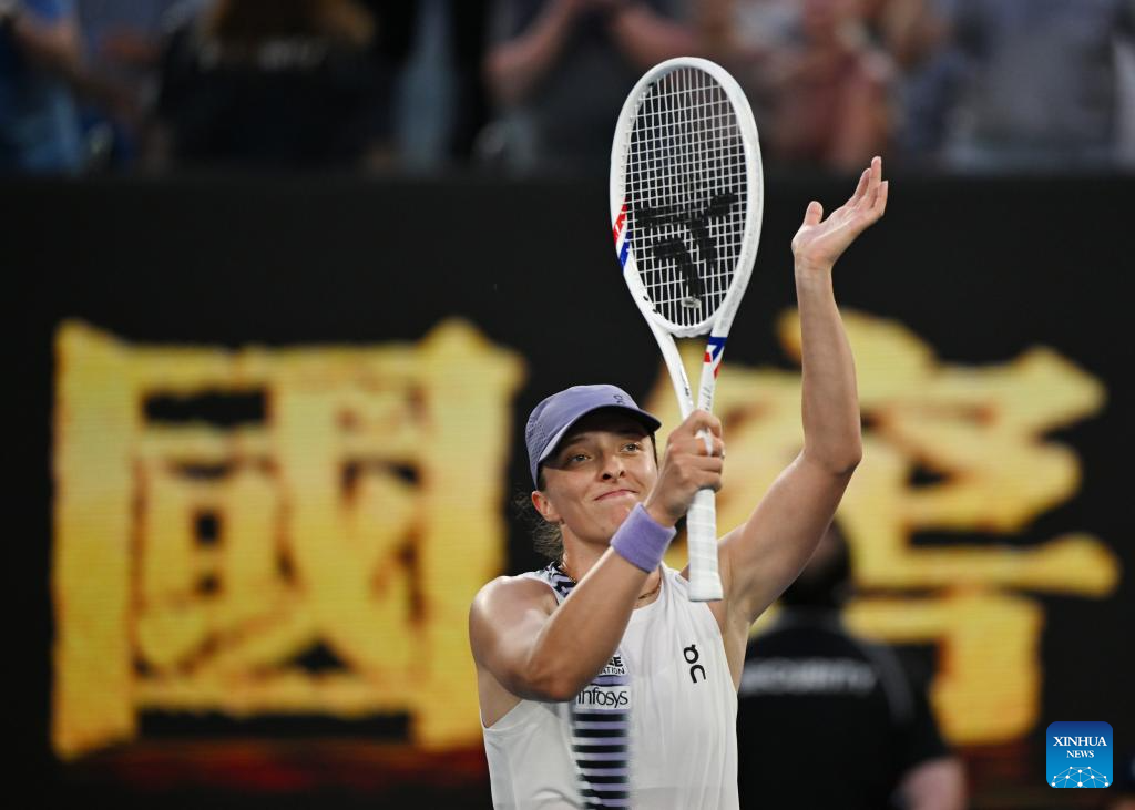 Iga Swiatek reacts after the women's singles 4th round match between Maddison Inglis of Australia and Iga Swiatek of Poland at the Australian Open tennis tournament in Melbourne, Australia, Jan. 26, 2026. (Photo by Wang Shen/Xinhua)