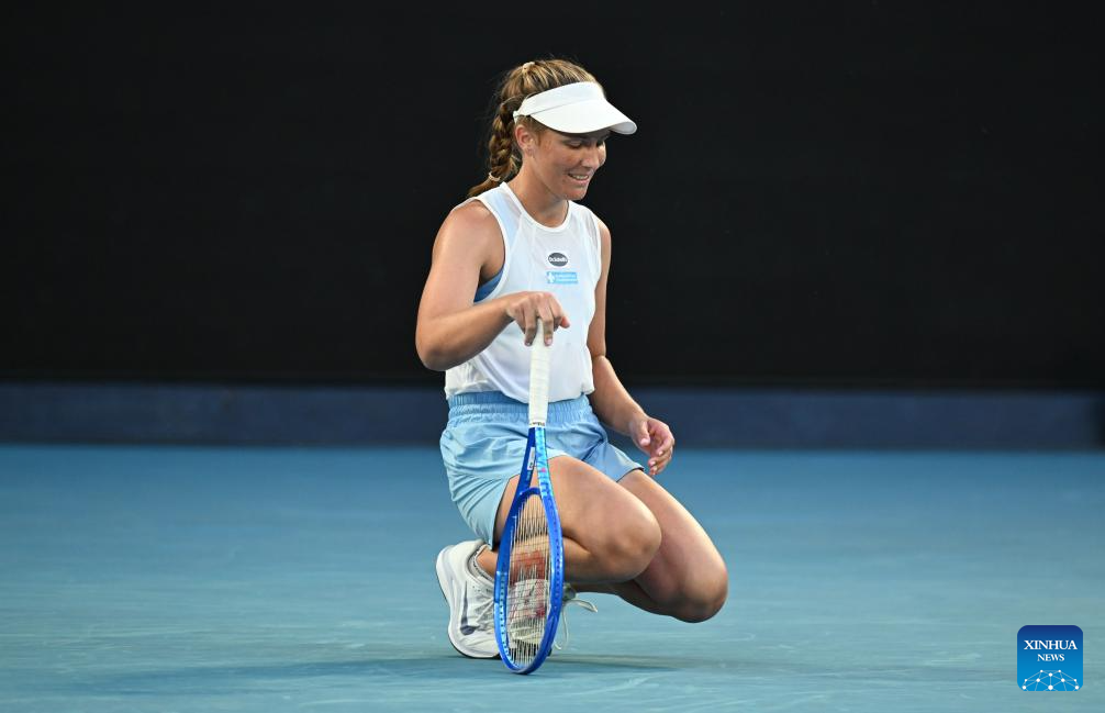 Maddison Inglis reacts during the women's singles 4th round match between Maddison Inglis of Australia and Iga Swiatek of Poland at the Australian Open tennis tournament in Melbourne, Australia, Jan. 26, 2026. (Photo by Wang Shen/Xinhua)