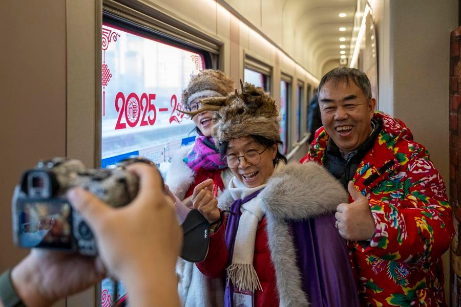 Passengers pose for photos on the Train Y783 in northeast China's Heilongjiang Province, Jan. 25, 2026. (Xinhua/Zhang Tao)