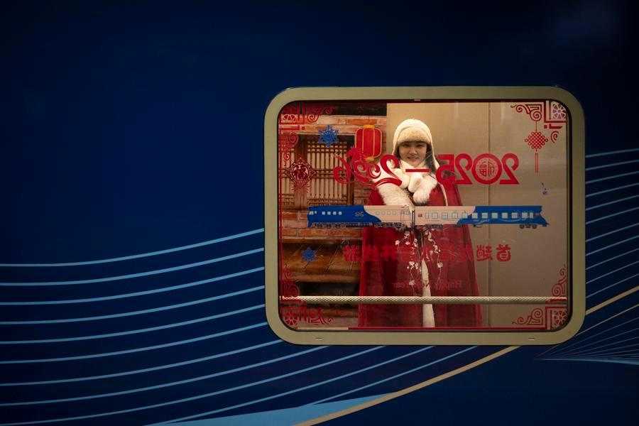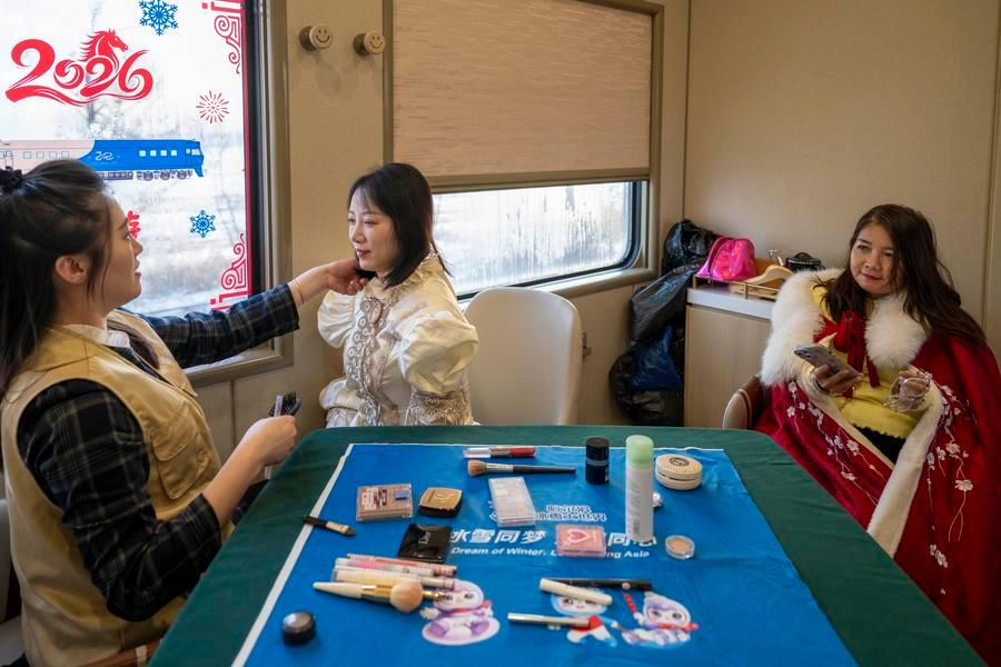 A staff member shows a costume for travel photography on the Train Y783 in northeast China's Heilongjiang Province, Jan. 25, 2026. (Xinhua/Zhang Tao)A photographer takes photos of a passenger on the Train Y783 in northeast China's Heilongjiang Province, Jan. 25, 2026. (Xinhua/Zhang Tao)This photo taken on Jan. 25, 2026 shows a passenger on the Train Y783 in northeast China's Heilongjiang Province. (Xinhua/Zhang Tao)A passenger views her photos on the camera of a photographer on the Train Y783 in northeast China's Heilongjiang Province, Jan. 25, 2026. (Xinhua/Zhang Tao)Staff members show costumes for travel photography beside the Train Y783 at the platform of Harbin East Railway Station in Harbin, northeast China's Heilongjiang Province, Jan. 25, 2026. (Xinhua/Zhang Tao)A passenger is made up on the Train Y783 in northeast China's Heilongjiang Province, Jan. 25, 2026. (Xinhua/Zhang Tao)