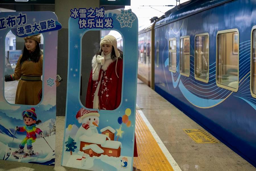 HARBIN, Jan. 26 (Xinhua) -- Train Y783, a themed tourism train bound for Yabuli featuring travel photography services, was inaugurated Sunday in Harbin, northeast China's Heilongjiang Province. Operated by China Railway Harbin Group Co., Ltd., the train marks the company's first offering of its kind this year, allowing passengers to dress in diverse costumes and avail themselves of photography services.