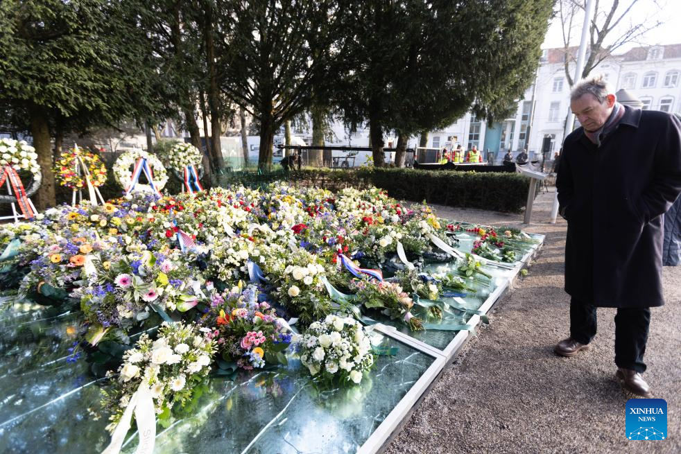 A man lays flowers during a commemoration ceremony on the occasion of the National Holocaust Remembrance Day in Wertheim Park in Amsterdam, the Netherlands, Jan. 25, 2026. The National Holocaust Remembrance Day is observed annually in the Netherlands on the last Sunday of January. (Photo by Sylvia Lederer/Xinhua)