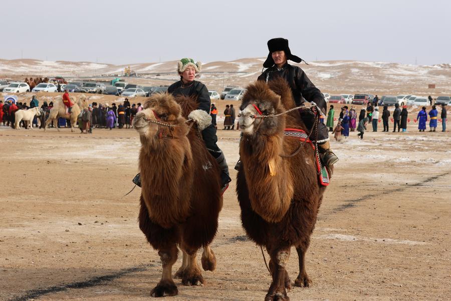 Participants are seen during a camel festival, in Mandalgovi, Dundgovi province, Mongolia, Jan. 25, 2026. (Photo by Bolortsetseg/Xinhua)