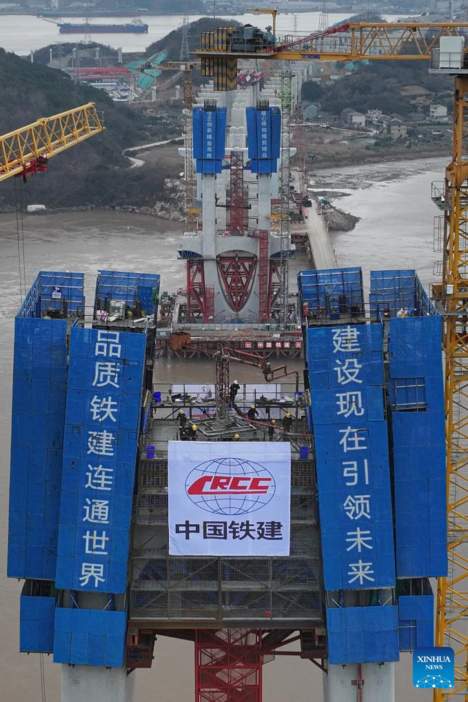 An aerial drone photo taken on Jan. 25, 2026 shows the concrete pouring site of the crossbeam on the east main tower of the Fuchimen road-rail bridge on the Ningbo-Zhoushan Railway in Zhoushan, east China's Zhejiang Province. The concrete pouring operation for the crossbeam on the east main tower of the Fuchimen road-rail bridge was completed successfully on Sunday, marking a breakthrough in the main tower's primary structure construction and laying a foundation for the subsequent construction of the entire bridge deck system.