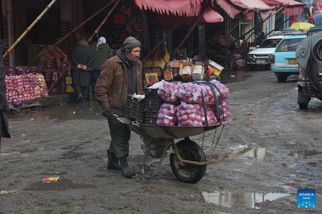 A vendor transfers fresh fruit in Kabul, Afghanistan, Jan. 27, 2026. Afghanistan's Ministry of Industry and Commerce said that the country exported 317,517 tonnes of fresh fruit over the past year, generating an estimated 142 million U.S. dollars, local media Tolo news reported on Monday. (Photo by Saifurahman Safi/Xinhua)