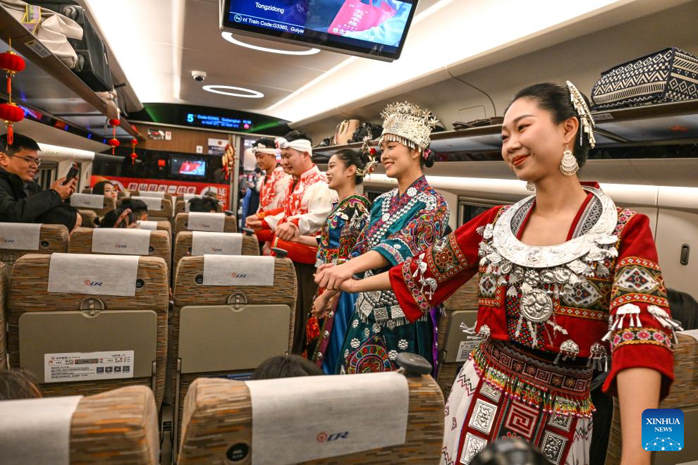 Volunteers dance on the high-speed train G3360 for passengers in southwest China's Guizhou Province, Jan. 26, 2026. Starting Jan. 26, the sacred revolutionary sites of Zunyi, southwest China's Guizhou Province, and Yan'an in northwest China's Shaanxi Province was linked by a direct high-speed rail service under the national railway schedule for the first quarter of 2026.