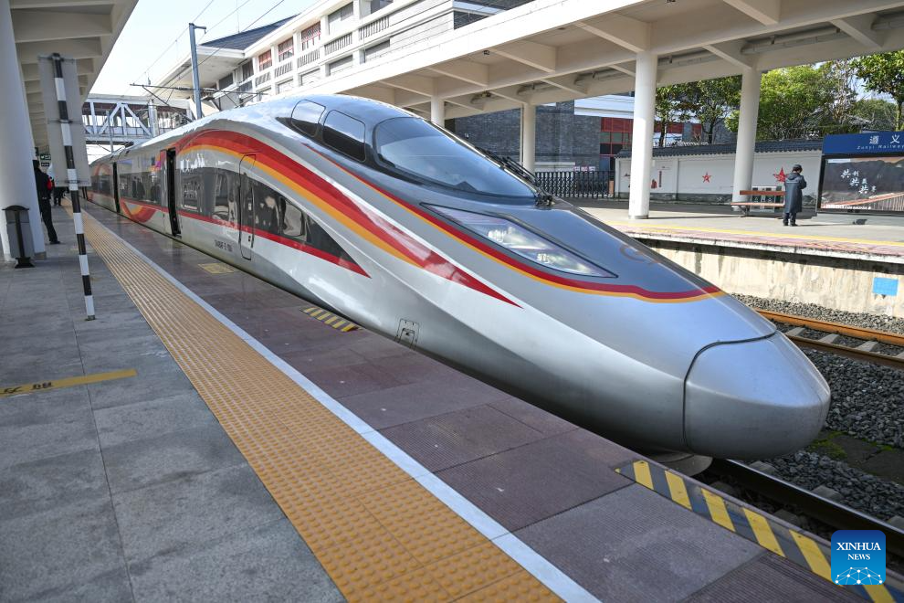 The high speed rail G3360 from Zunyi of southwest China's Guizhou Province to Yan'an of northwest China's Shaanxi Province is pictured at Zunyi Railway Station in southwest China's Guizhou Province, Jan. 26, 2026. Starting Jan. 26, the sacred revolutionary sites of Zunyi, southwest China's Guizhou Province, and Yan'an in northwest China's Shaanxi Province was linked by a direct high-speed rail service under the national railway schedule for the first quarter of 2026.