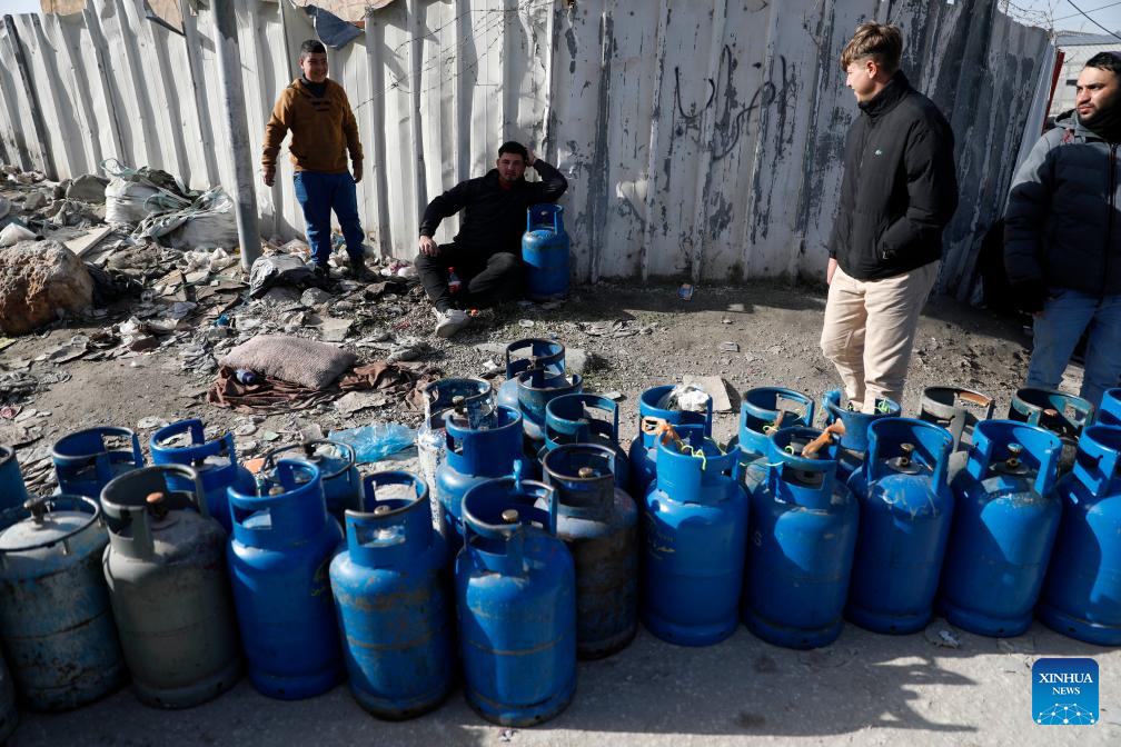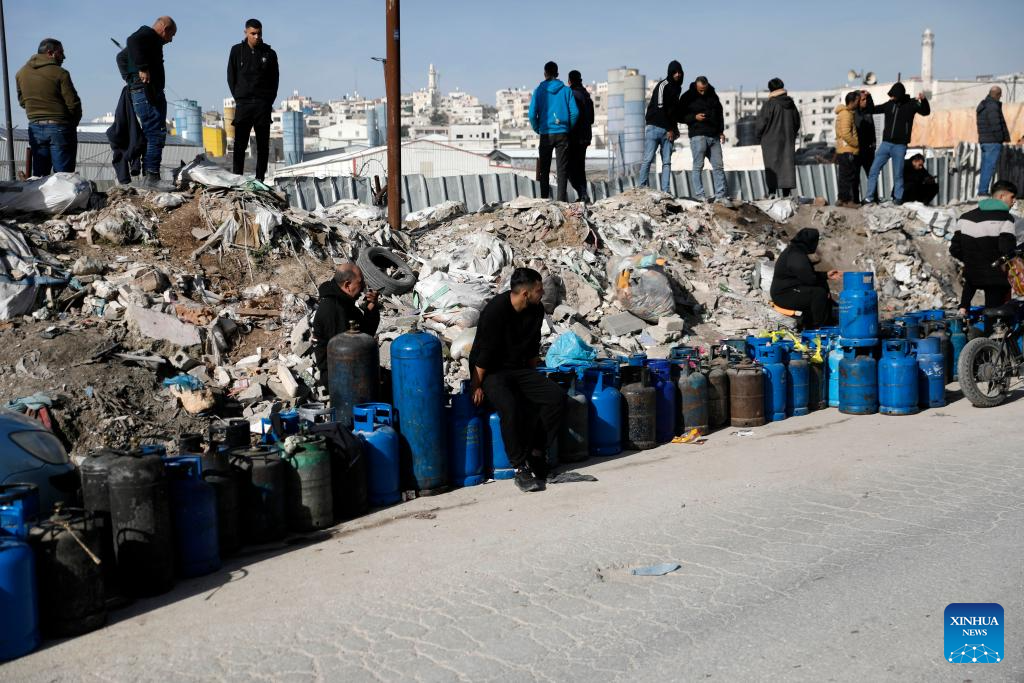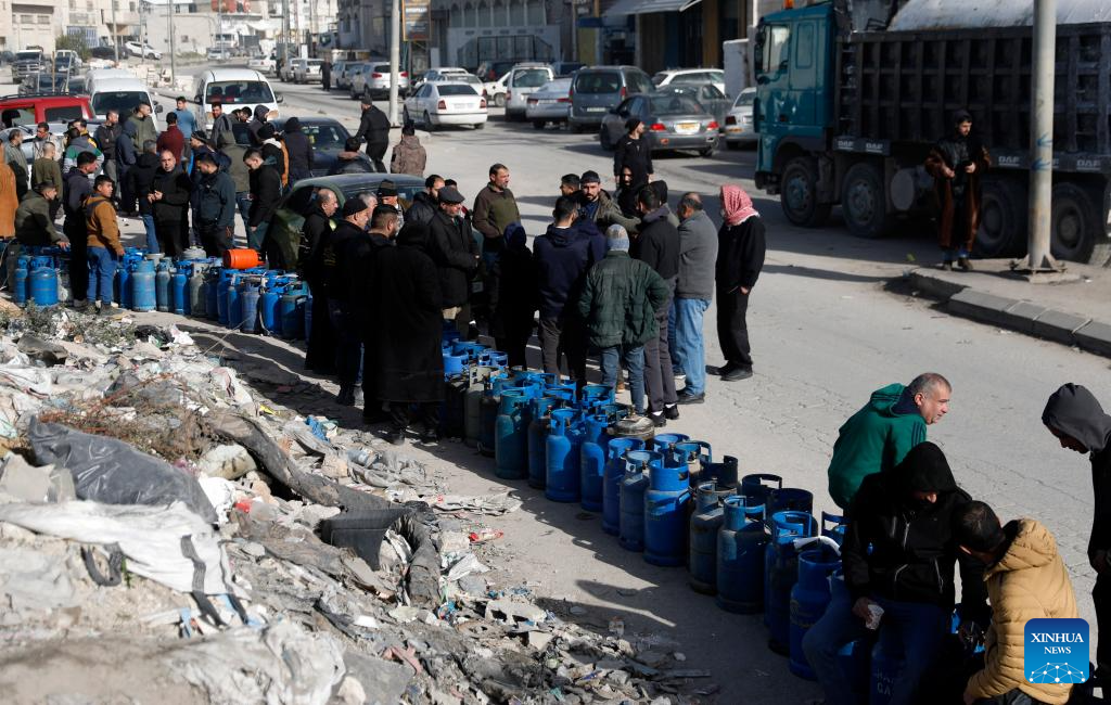 Palestinians wait to refill cooking gas cylinders at a gas station in the West Bank city of Hebron on Jan. 25, 2026. Most West Bank governorates are facing a serious shortage of household gas due to cold winter weather and reduced supplies. The shortage has caused long queues at gas stations and raised concerns that the crisis may continue. (Photo by Mamoun Wazwaz/Xinhua)