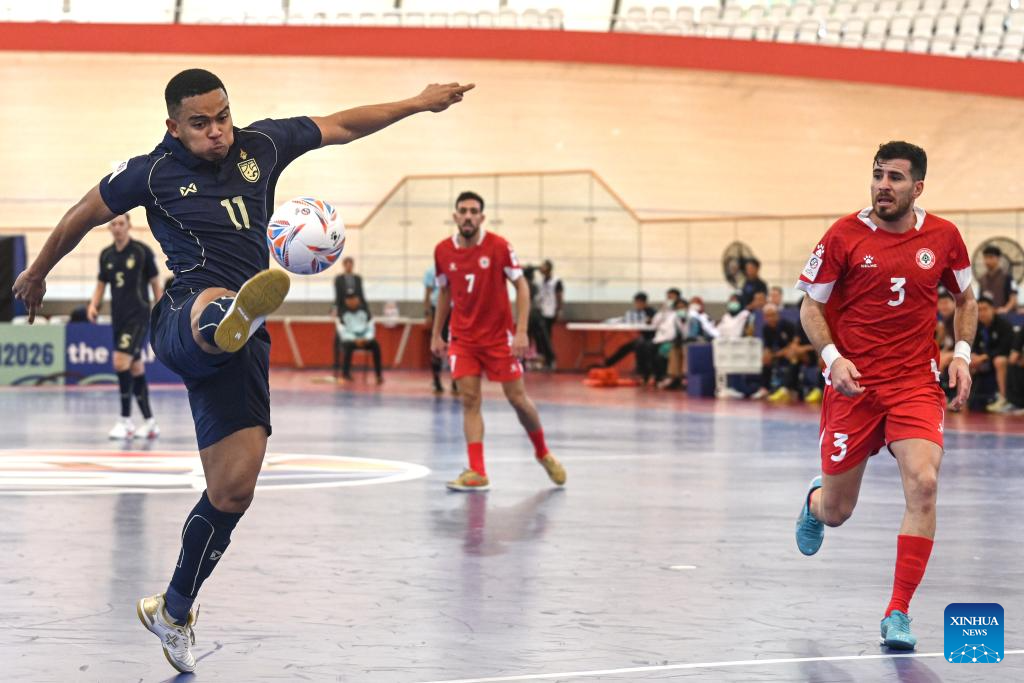 Amarin Akapan (L) of Thailand shoots during the Group B match between Thailand and Lebanon at the AFC Futsal Asian Cup 2026 in Jakarta International Velodrome, Jakarta, Indonesia, Jan. 27, 2026. (Xinhua/Agung Kuncahya B.)