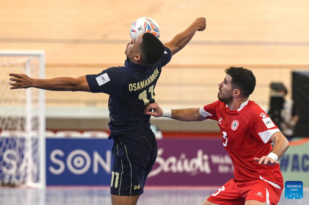 Mario Abou Jaoude (front L) of Lebanon competes during the Group B match between Thailand and Lebanon at the AFC Futsal Asian Cup 2026 in Jakarta International Velodrome, Jakarta, Indonesia, Jan. 27, 2026. (Xinhua/Agung Kuncahya B.)