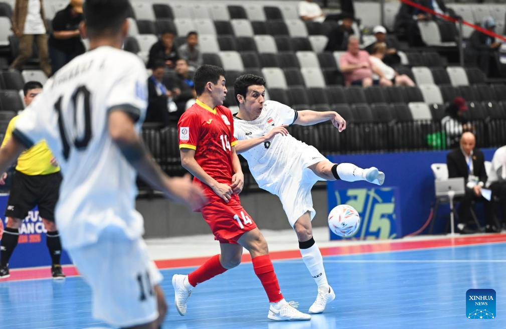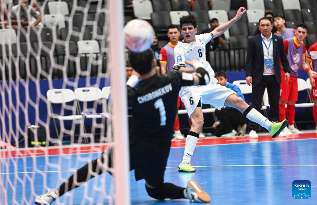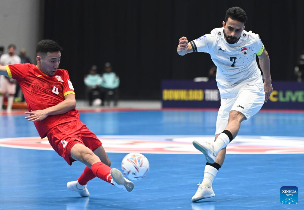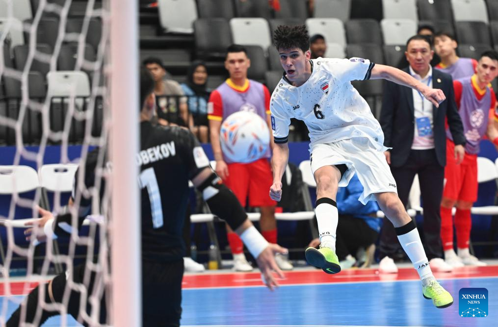 Harith Saad Maroof Al-Obaidi (R) of Iraq shoots during the group A match between Iraq and Kyrgyz Republic at the AFC Futsal Asian Cup 2026 in Jakarta, Indonesia, Jan. 27, 2026. (Xinhua/Zulkarnain)
