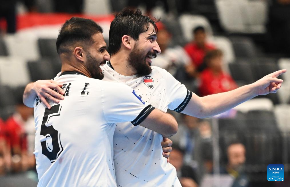 Tareq Zeyad Sulaiman (R) of Iraq celebrates after scoring during the group A match between Iraq and Kyrgyz Republic at the AFC Futsal Asian Cup 2026 in Jakarta, Indonesia, Jan. 27, 2026. (Xinhua/Zulkarnain)