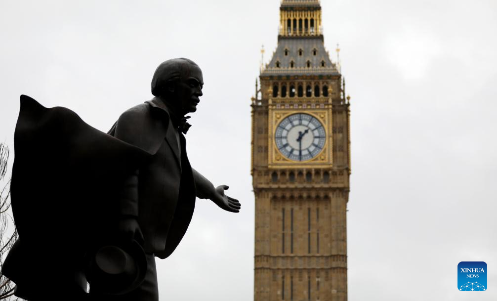 A sculpture near the Big Ben is seen in London, Britain, Jan. 27, 2026, as Storm Chandra hits the country. (Xinhua/Li Ying)