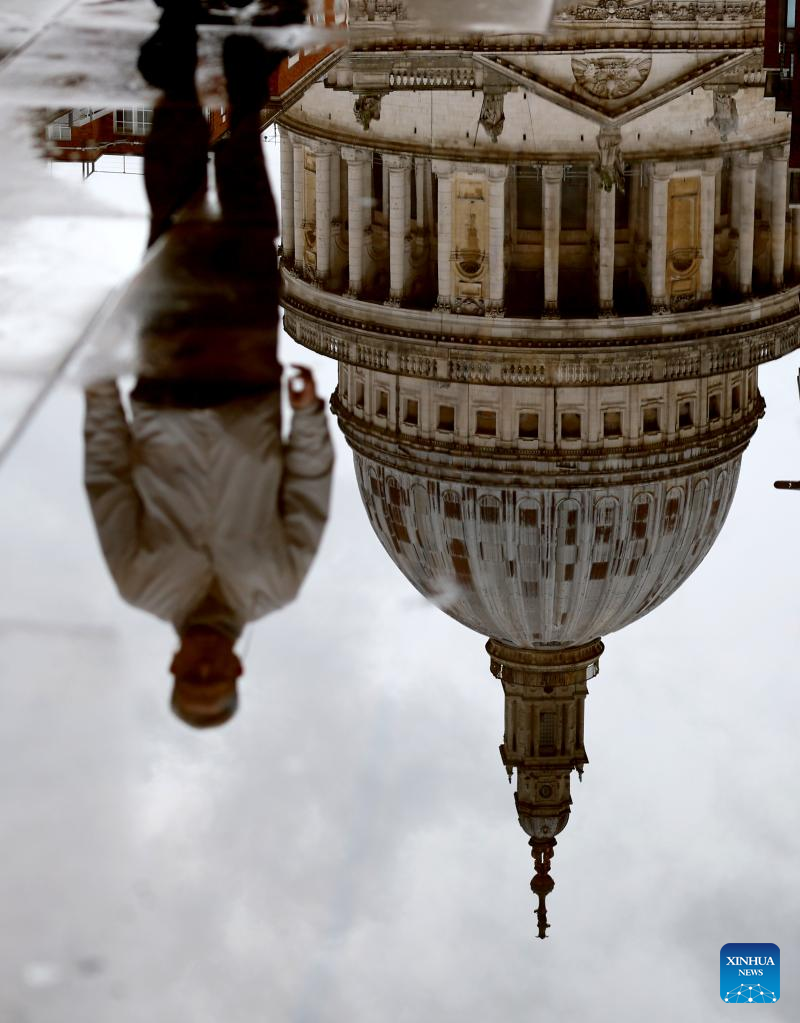 A reflection of St Paul's Cathedral and a pedestrian walking past is seen in a puddle in London, Britain, Jan. 27, 2026, as Storm Chandra brings rain to much of the country. (Xinhua/Li Ying)