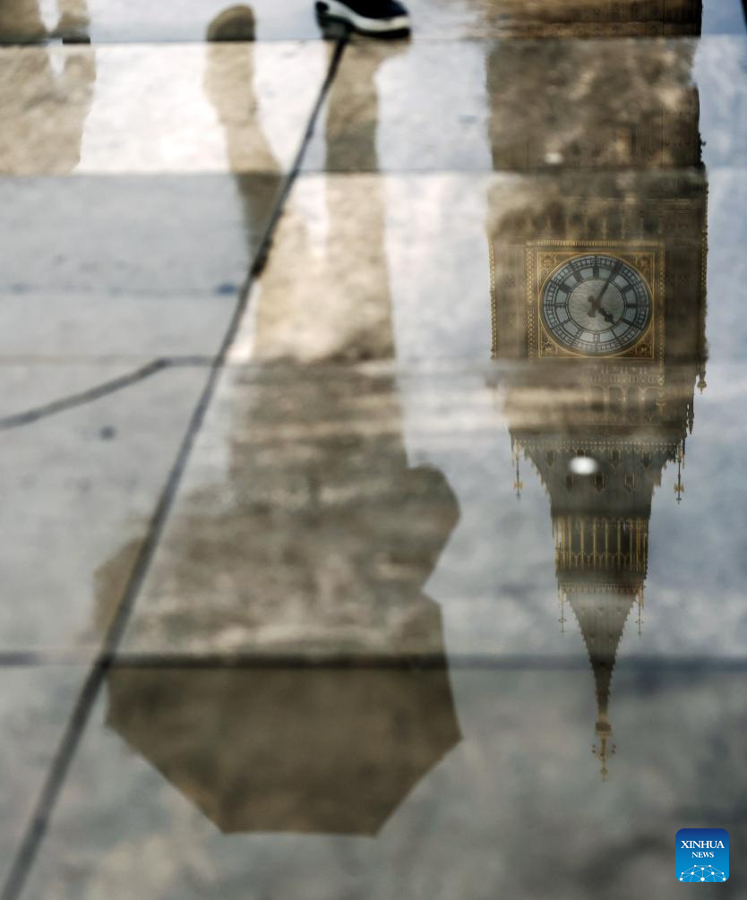 A reflection of the Big Ben and a pedestrian walking past with an umbrella is seen in a puddle in London, Britain, Jan. 27, 2026, as Storm Chandra brings rain to much of the country. (Xinhua/Li Ying)