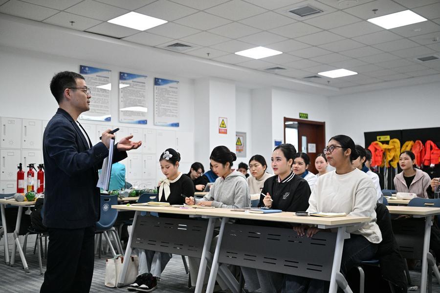 Thai students from Suan Dusit University learn cabin safety management during an exchange activity at the Civil Aviation University of China in Tianjin, north China, Jan. 8, 2026. (Xinhua/Sun Fanyue)
