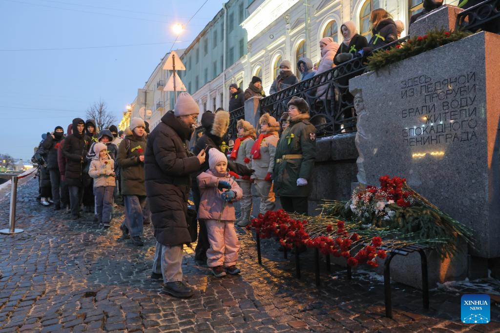 People lay flowers at a memorial in St. Petersburg, Russia, Jan. 27, 2026. A series of events are held in St. Petersburg on Jan. 27 to mark the 82nd anniversary of the victory in the Siege of Leningrad during the Great Patriotic War of the Soviet Union. (Photo by Irina Motina/Xinhua)