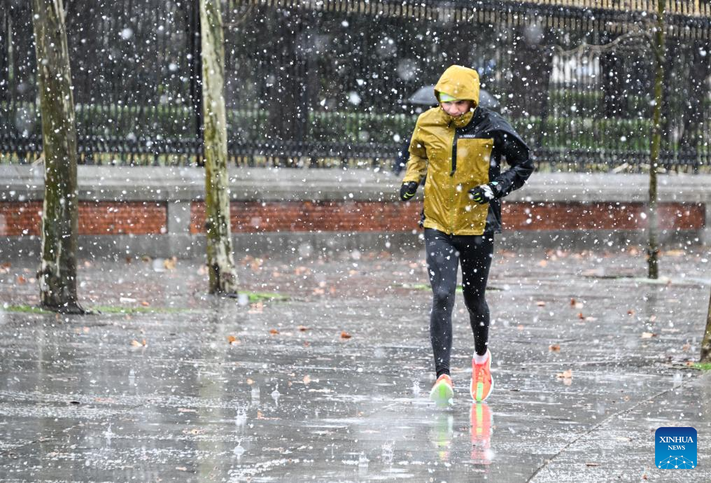 A man jogs in snow in Madrid, Spain, Jan. 28, 2026. (Xinhua/Cheng Min)
