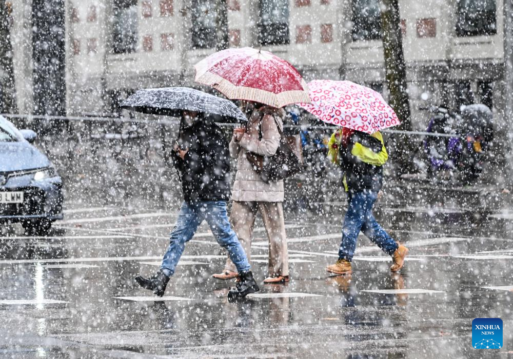 People walk in snow in Madrid, Spain, Jan. 28, 2026. (Xinhua/Cheng Min)