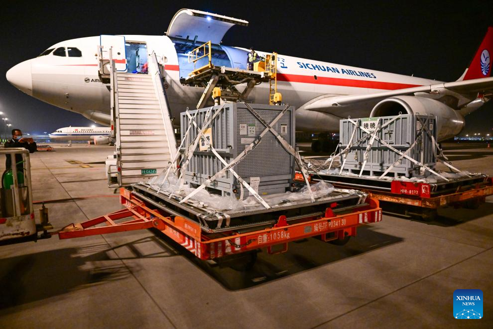 Giant pandas Xiao Xiao and Lei Lei arrive at the Chengdu Tianfu International Airport in Chengdu, southwest China's Sichuan Province, Jan. 28, 2026.