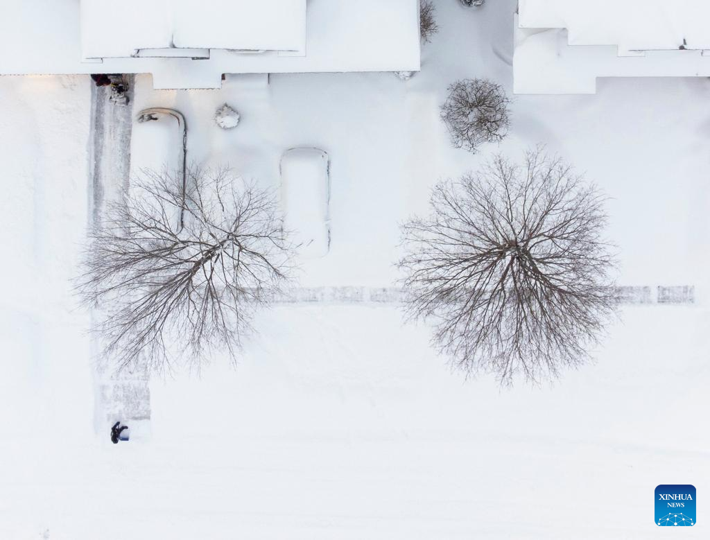An aerial drone photo taken on Jan. 26, 2026 shows a resident clearing snow in Oakville, the Greater Toronto Area, Canada. (Photo by Zou Zheng/Xinhua)