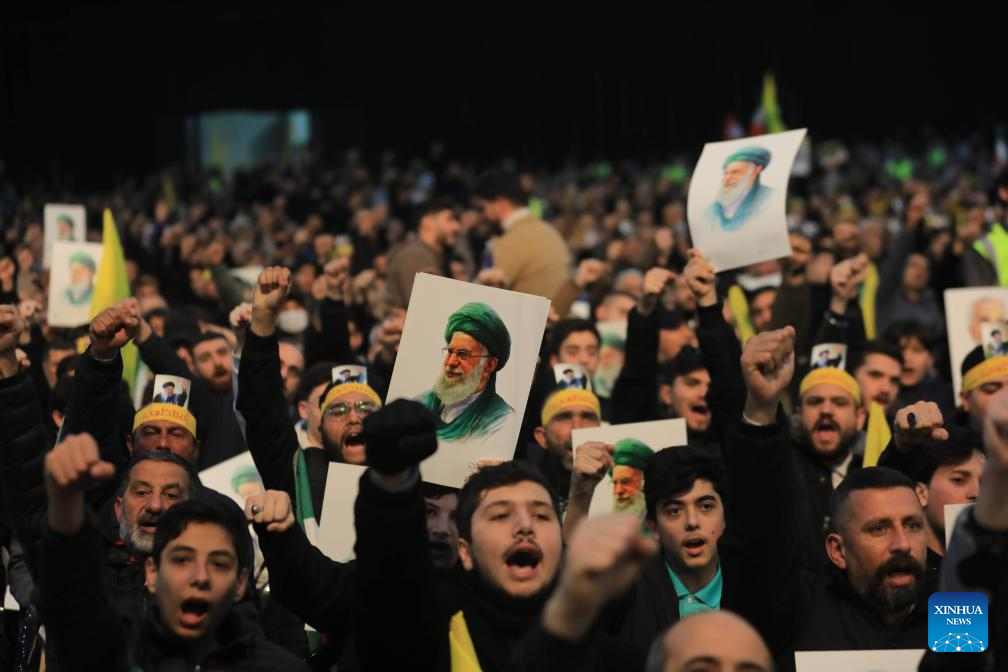 Photo taken on Jan. 26, 2026 shows Hezbollah supporters holding portraits of Iranian Supreme Leader Ali Khamenei during a rally to voice support for Iran and denounce U.S. threats in Beirut, Lebanon. (Photo by Bilal Jawich/Xinhua)