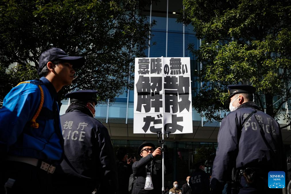 A protester holds a sign during a campaign event of Japanese Prime Minister Sanae Takaichi in Tokyo, Japan, on Jan. 27, 2026. Campaigning for Japan's Feb. 8 snap general election officially kicked off across the country on Tuesday with all 465 seats in the House of Representatives up for contest. Of the 465 lower house seats, 289 will be elected from single-member districts and 176 through proportional representation in 11 regional blocs. National broadcaster NHK said more than 1,200 candidates are expected to run. (Xinhua/Jia Haocheng)