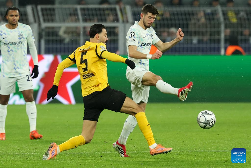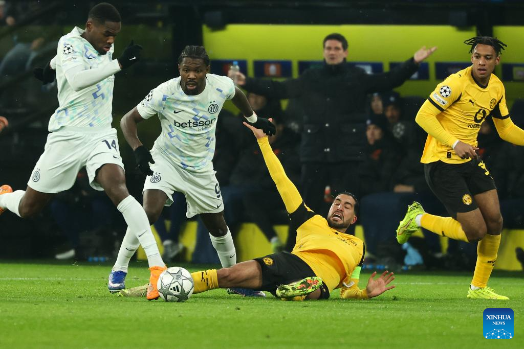 Emre Can (2nd R) of Borussia Dortmund vies with Marcus Thuram (2nd L) and Ange-Yoan Bonny (1st L) of Inter Milan during the UEFA Champions League football match between Borussia Dortmund and Inter Milan in Dortmund, Germany, Jan. 28, 2026. (Photo by Joachim Bywaletz/Xinhua)
