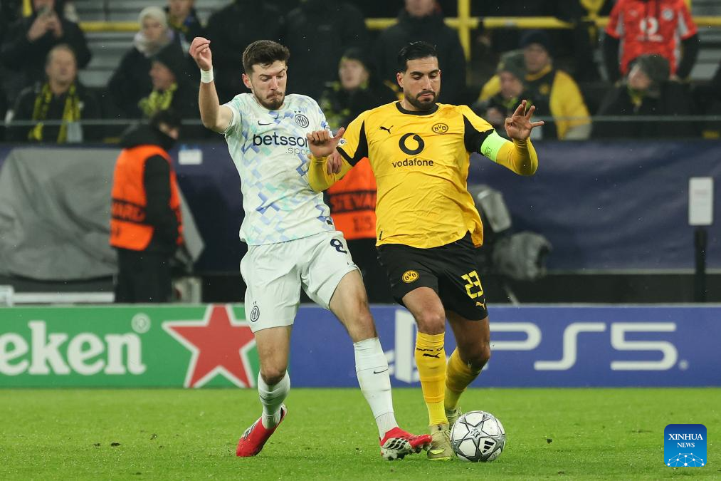 Emre Can (R) of Borussia Dortmund vies with Petar Sucic of Inter Milan during the UEFA Champions League football match between Borussia Dortmund and Inter Milan in Dortmund, Germany, Jan. 28, 2026. (Photo by Joachim Bywaletz/Xinhua)