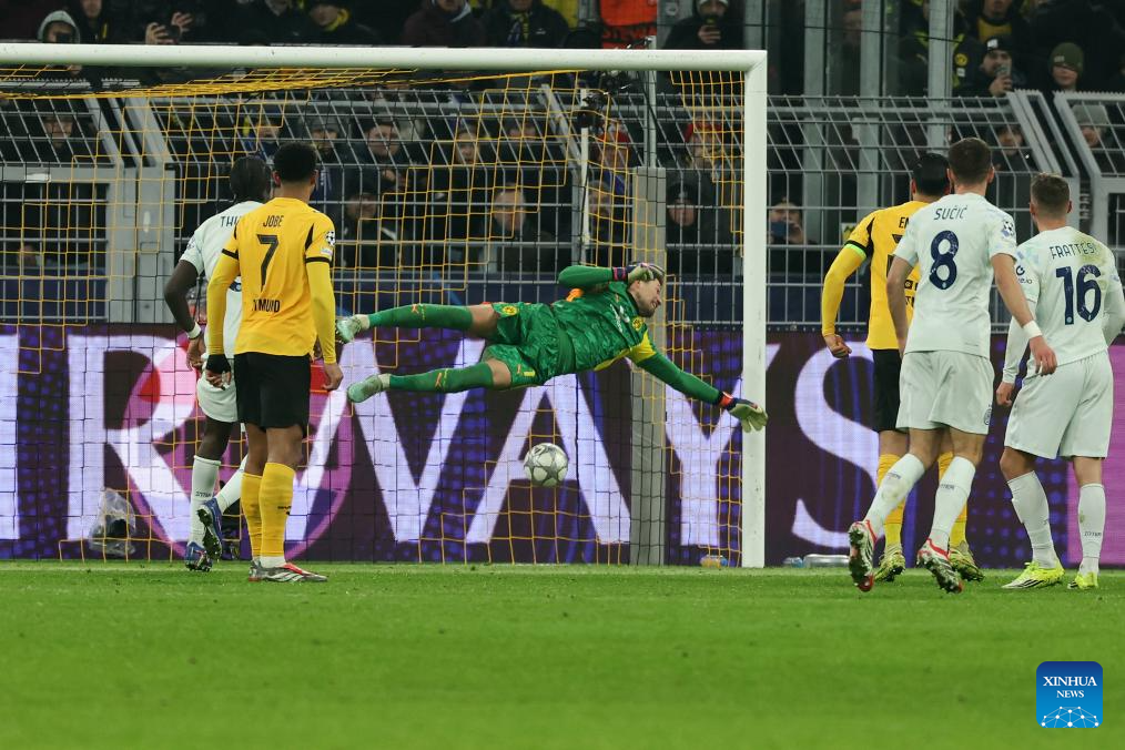 Borussia Dortmund's goalkeeper Gregor Kobel (rear) fails to make a save during the UEFA Champions League football match between Borussia Dortmund and Inter Milan in Dortmund, Germany, Jan. 28, 2026. (Photo by Joachim Bywaletz/Xinhua)