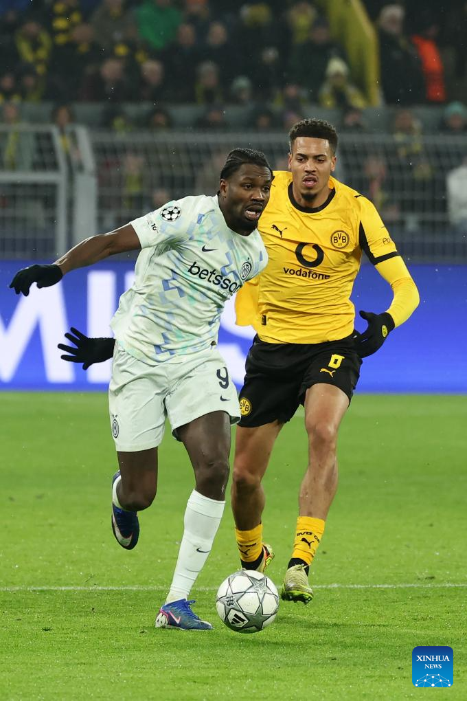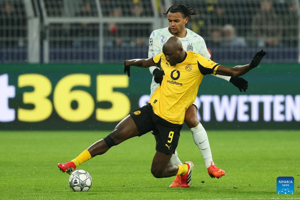 Serhou Guirassy (R) of Borussia Dortmund vies with Manuel Akanji of Inter Milan during the UEFA Champions League football match between Borussia Dortmund and Inter Milan in Dortmund, Germany, Jan. 28, 2026. (Photo by Joachim Bywaletz/Xinhua)