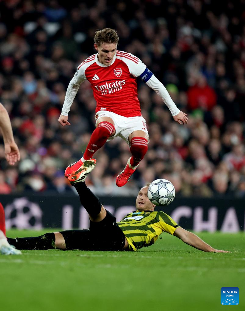 Arsenal's Martin Odegaard (top) vies for the ball during the UEFA Champions League football match between Arsenal and Kairat Almaty in London, Britain, Jan. 28, 2026. (Xinhua/Li Ying)