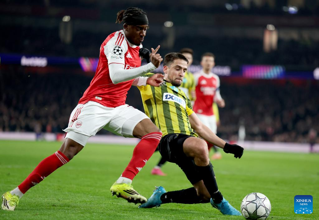 Arsenal's Noni Madueke (L) vies for the ball during the UEFA Champions League football match between Arsenal and Kairat Almaty in London, Britain, Jan. 28, 2026. (Xinhua/Li Ying)