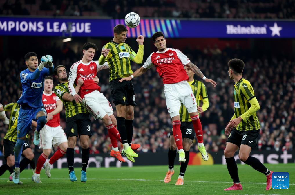 Arsenal's Piero Hincapie (top 1st R) vies for the ball with Kairat Almaty's Aleksandr Martynovich (top 2nd R) during the UEFA Champions League football match between Arsenal and Kairat Almaty in London, Britain, Jan. 28, 2026. (Xinhua/Li Ying)
