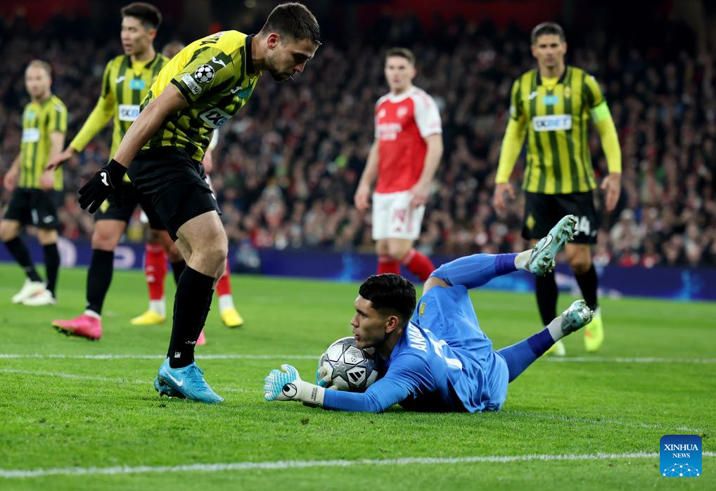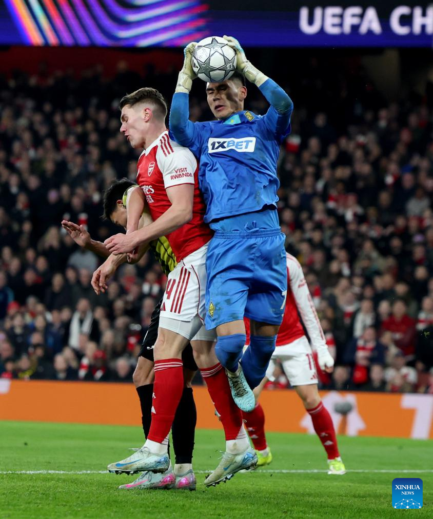 Kairat Almaty's goalkeeper Temirlan Anarbekov (R) saves the ball during the UEFA Champions League football match between Arsenal and Kairat Almaty in London, Britain, Jan. 28, 2026. (Xinhua/Li Ying)