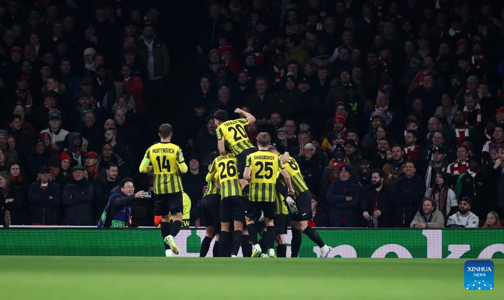 Kairat Almaty's players celebrate scoring during the UEFA Champions League football match between Arsenal and Kairat Almaty in London, Britain, Jan. 28, 2026. (Xinhua/Li Ying)